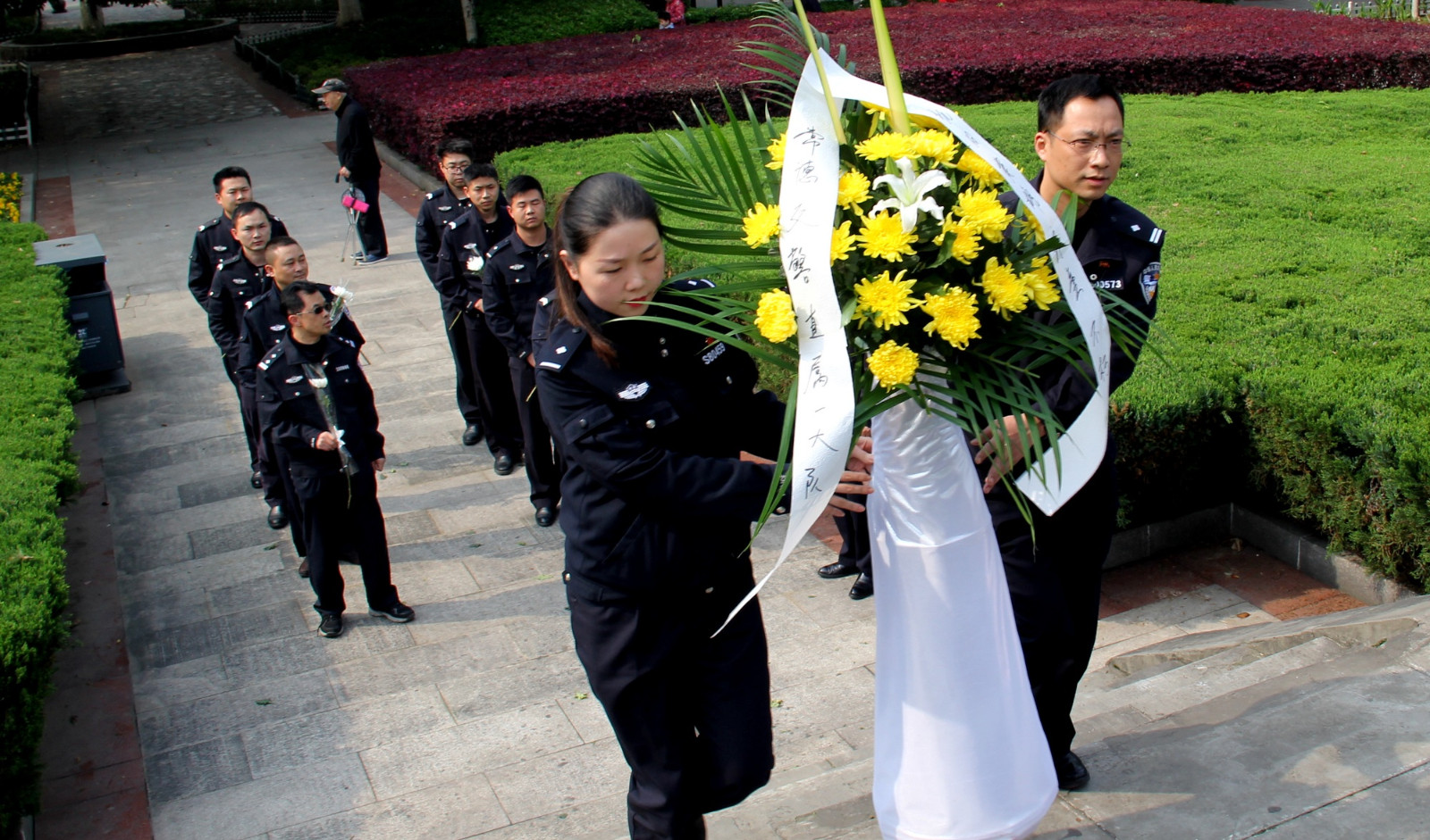 向烈士獻花籃 參加活動的民警、協警們懷著無比崇高的敬意向為祖國、為人民、為常德這座城市在抗戰期間貢獻生命的英烈們鞠躬,獻花藍,并默哀一分鐘。在紀念碑下,副大隊長楊軍輝向大家講述了抗戰中常德會戰的重要意義和以身殉職革命先烈們的英雄事跡,號召大家一定要繼承先烈遺志,學習他們不畏艱險、勇往直前的敢戰精神;學習他們熱愛和平,忠于人民、忠于國家的犧牲精神,并把這種精神以飽滿的政治熱情投入到自己當前從事的公安交管工作中去,同時也要珍惜革命先烈用鮮血和生命換來安定與祥和的社會、立足本職,扎實工作,為保一方暢安貢獻自己的力量。 -