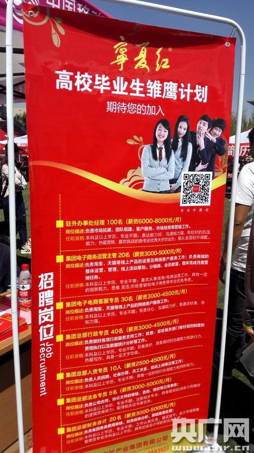 招聘廣告(央廣網記者許新霞 攝) 根據統計,崗位需求排前五的分別是培訓教育、市場營銷、信息技術、生物化工和人資行政。活動當天吸引了來自陜西、甘肅、內蒙古及寧夏周邊地區高校畢業生近萬人次入場求職應聘,達成意向性協議的占到五分之一以上。