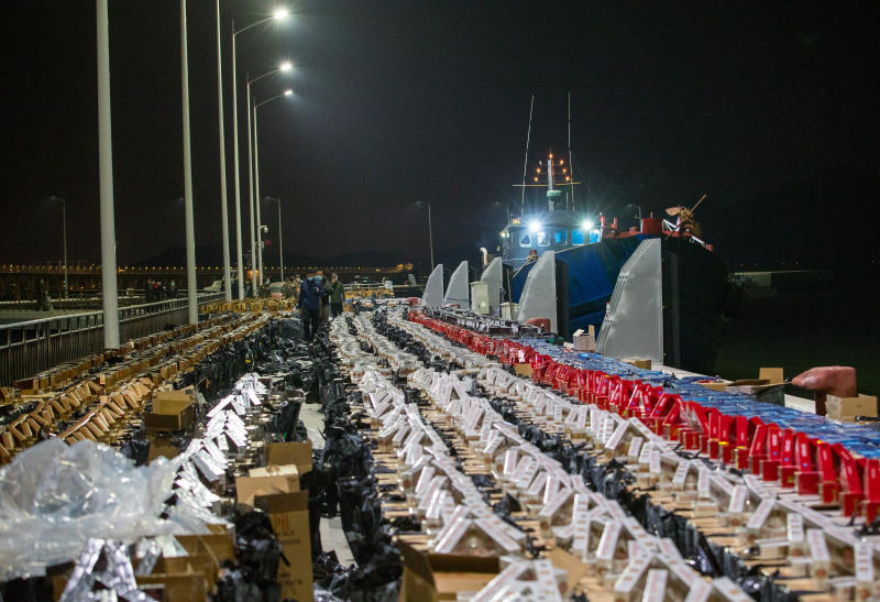 當(dāng)天,廣東深圳海警局接線報稱,在深圳擔(dān)杠頭附近海域有疑似走私活動,當(dāng)局隨即派出南山工作站執(zhí)法艇前往查緝。14時許,海警執(zhí)法艇在該海域發(fā)現(xiàn)一艘無舷號鐵殼船,形跡可疑,海警執(zhí)法員隨即靠近喊話并逼停嫌疑船。經(jīng)登臨檢查發(fā)現(xiàn),船上裝載有大批香煙,船上人員均無法提供相關(guān)合法單證,海警執(zhí)法員遂將涉案人員及船舶等帶回做進(jìn)一步處理。經(jīng)查,船上共裝有國內(nèi)外知名品牌香煙,共計20萬余條,目前,案件正在進(jìn)一步偵辦中。