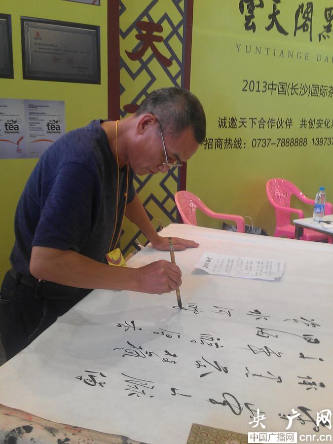在一個(gè)展臺(tái)前,安化縣書協(xié)主席蔣穩(wěn)巖揮毫潑墨忙得不亦樂乎,現(xiàn)場(chǎng)求字的觀眾排起了長隊(duì)。“茶禪一味”等與茶關(guān)聯(lián)的書法作品鋪滿了展臺(tái)的前前后后。一位退休老同志在這里義務(wù)幫他研磨、按紙忙活了4天,他興奮地告訴記者,做“書法志愿者”的目的就是為了跟蔣主席學(xué)點(diǎn)“絕活”。