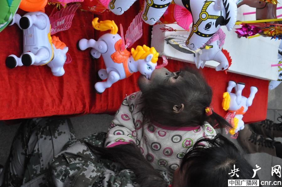 來到年貨街里,迎接動物們的就是一排排風車和充氣小馬玩具。飼養員李大姐抱著毛毛在年貨攤前蹲下,讓毛毛自己挑選喜歡的禮物。毛毛看著一排排的禮物開始發愣了,它先用手摸摸充氣小馬,再用手摸摸風車。最后,毛毛選了一個塑料做的小馬玩具。毛毛撅著嘴把小馬的頭含在了里面就把它抱在懷里。