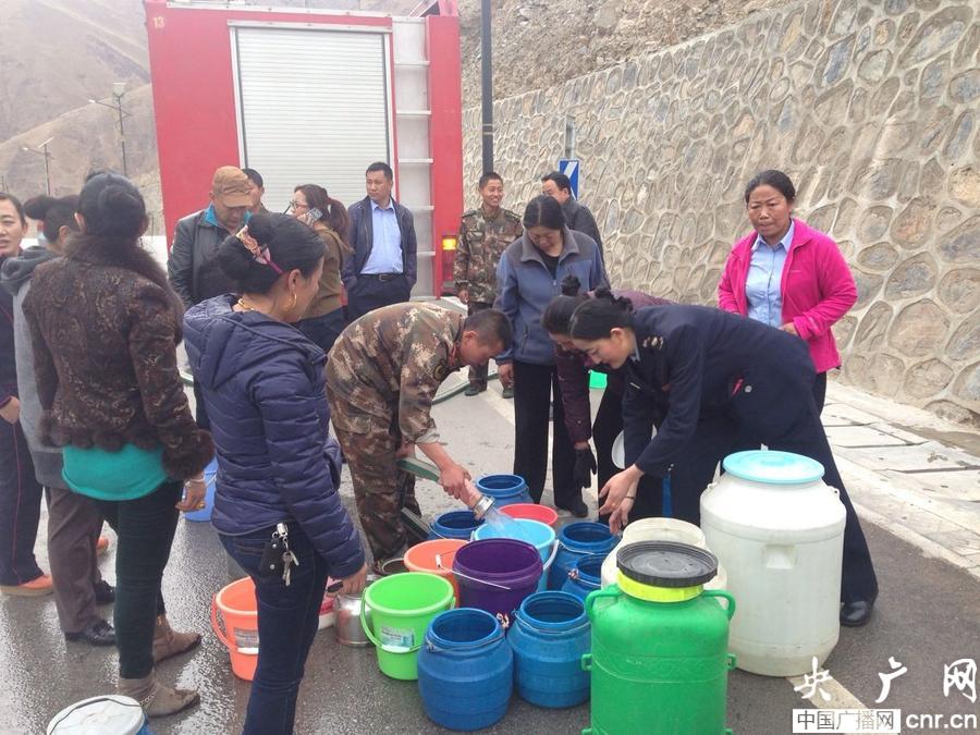 在各個送水點,聽說消防官兵要來送水,群眾早已準備好水桶、水盆等盛水工具排好了長隊。當一股股清泉從消防車流進水桶時,一股暖流也流進了群眾的心里。扎央看著自己水桶里的水樂得合不攏嘴:“多虧了消防官兵及時送水,不然做飯都成了問題,謝謝消防官兵!”排隊等水的人群中有不少老人或體弱的居民,消防官兵便主動拿起水桶幫他們把水送到家里。當消防官兵離開時,受助群眾主動出門相送。官兵們表示,只要能讓百姓喝上放心水,自己再苦再累也是值得的。