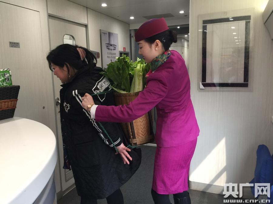 2月18日,家住資中的羅女士乘坐10點11分途經資中北站的G8508次列車到成都看望兒子。看著她攜帶滿滿一背簍的新鮮蔬菜,乘務員立即搭手幫她取下,乘務員熱心的幫忙,讓羅女士侃侃而談!艾F在你們這高鐵太方便了,我以前坐大巴要兩個多小時,現在坐高鐵半個多小時就到了!我上午從資中買的菜,中午就可以拿到成都做午飯了,真好!”