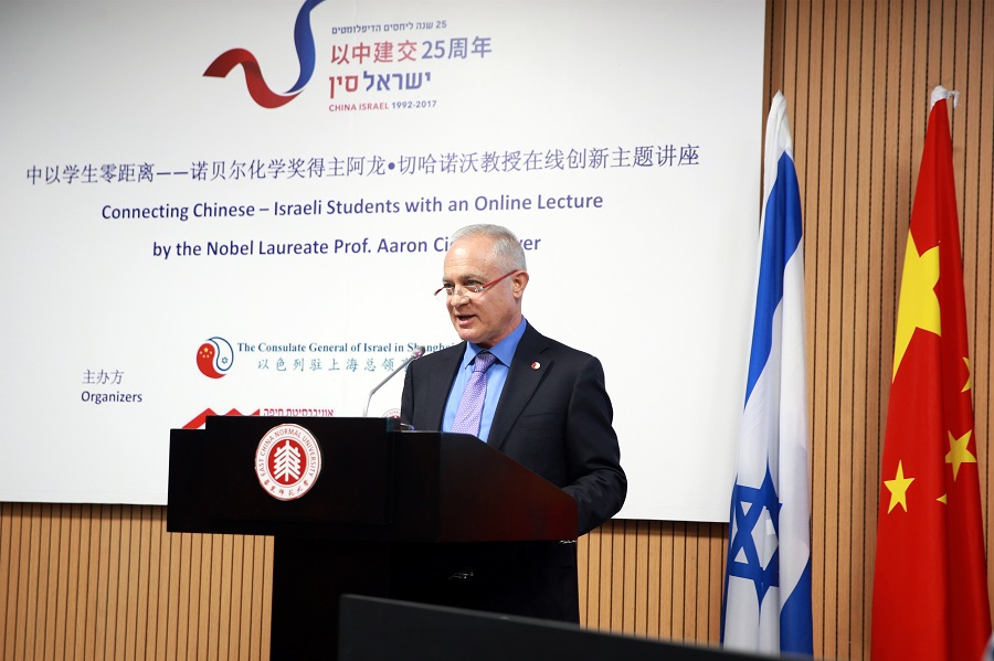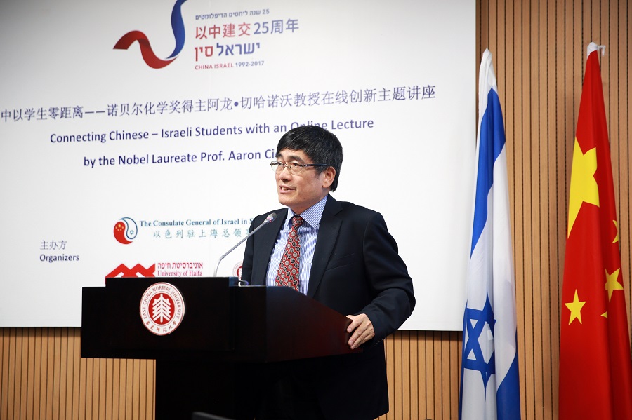 央廣網(wǎng)上海5月24日消息(記者傅聞捷)為紀念中以建交二十五周年,“中以學(xué)生零距離——諾貝爾化學(xué)獎得主阿龍·切哈諾沃教授在線創(chuàng)新主題講座”昨天在華東師范大學(xué)舉行。本次活動由華東師范大學(xué)、以色列駐上海總領(lǐng)事館和以色列海法大學(xué)聯(lián)合舉辦。