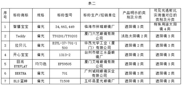 此外,不同類別的兒童太陽鏡及鏡片的透射比標準不同。可見光透射比過高,太陽鏡無法阻擋強光的照射,失去了遮陽效果;可見光透射比過低,則會影響到使用者的視覺敏感度。檢測結果顯示,7件樣品的可見光透射比實測值與其明示的類別或分類不符(詳見表二)。