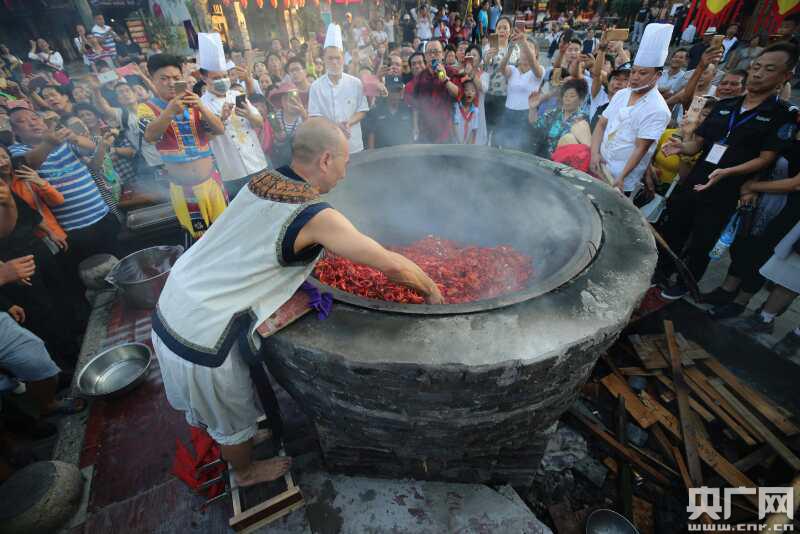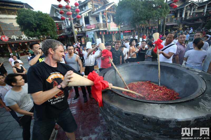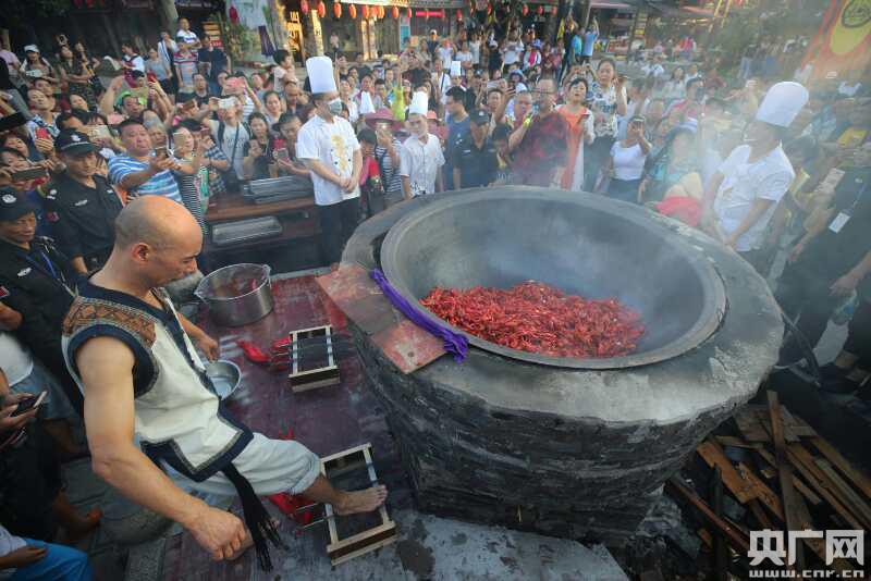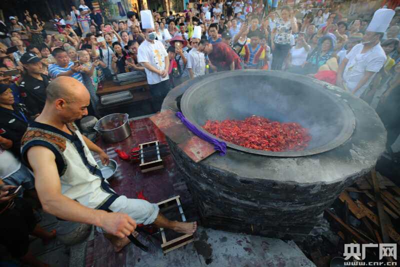 2017年9月26日,在張家界市武陵源區非遺體驗基地溪布老街民間藝人唐承剛雙腳踩在鋒利的刀刃上,徒手在直徑2米、溫度近260度的油鍋里炒龍蝦。
