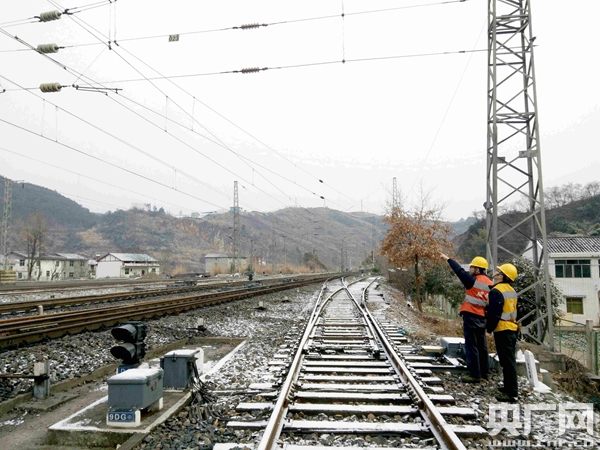 1月27日,成都供電段組織干部職工對此次降雪受影響區段接觸網關鍵設備進行巡視。(李煒 攝)