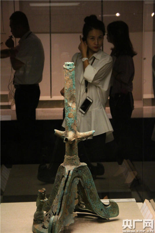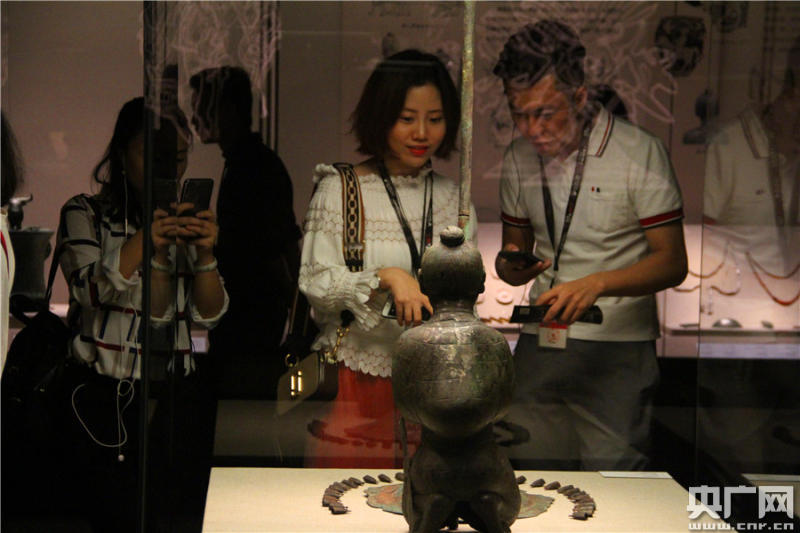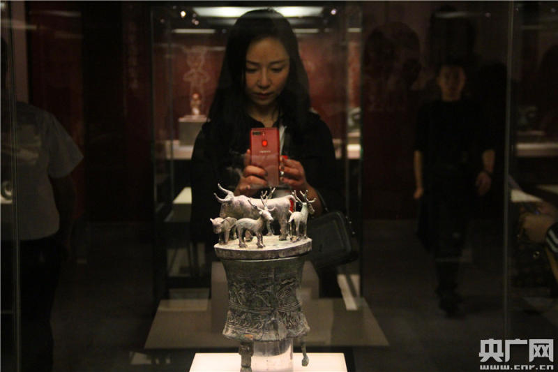 一名觀眾在欣賞“戰國時期的虎鹿牛銅貯貝器”(央廣網發 記者賈宜超攝)