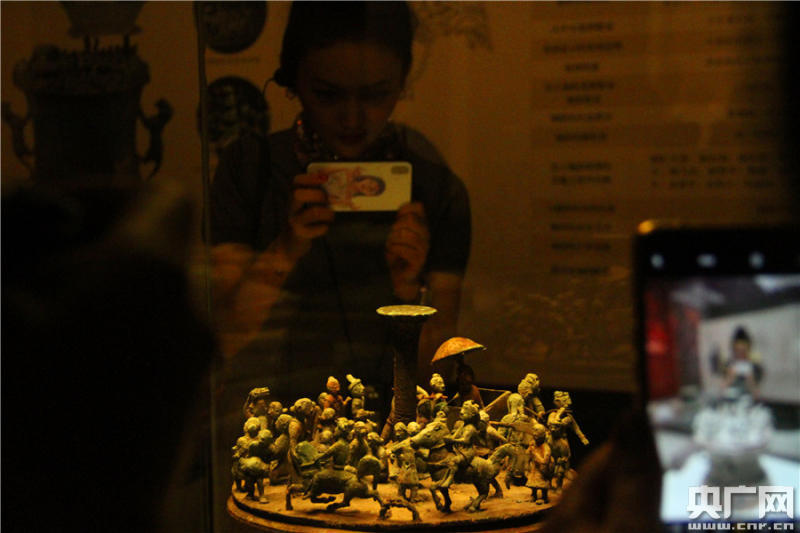 觀眾在欣賞“西漢時期的執傘跪坐俑”(央廣網發 記者賈宜超攝)