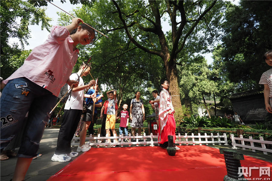 進行展覽的同時,在成都武侯祠博物館三國文化陳列室前還舉行了一場別開生面的“三國運動會”。20名身著漢服的小小講解員與來自全國各地的博物館觀眾共同參與包含投壺、射禮、五禽戲、蹴鞠的互動游戲。
