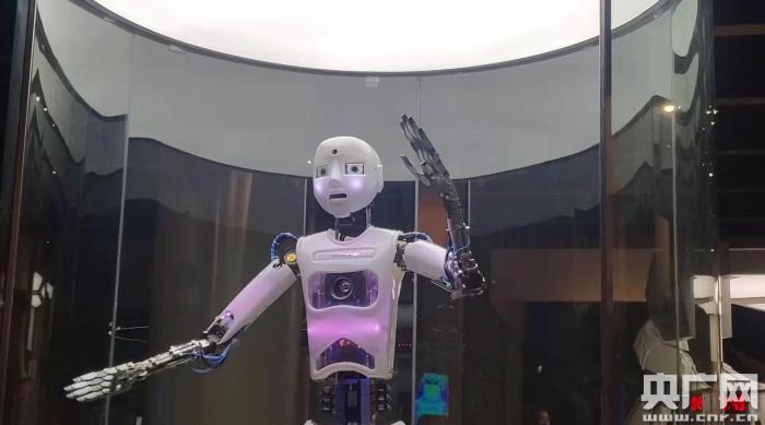 人形機器人小羅正在演唱歌曲《我和我的祖國》,眼神、手勢、身姿都惟妙惟肖。(央廣網(wǎng)記者 劉陽 攝)