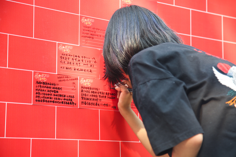 現(xiàn)場人頭攢動,師生們爭相寫下對2049年的祖國、母校和自己的展望,并將明信片貼在背景墻上,拼成了“I·CHINA”的大字。