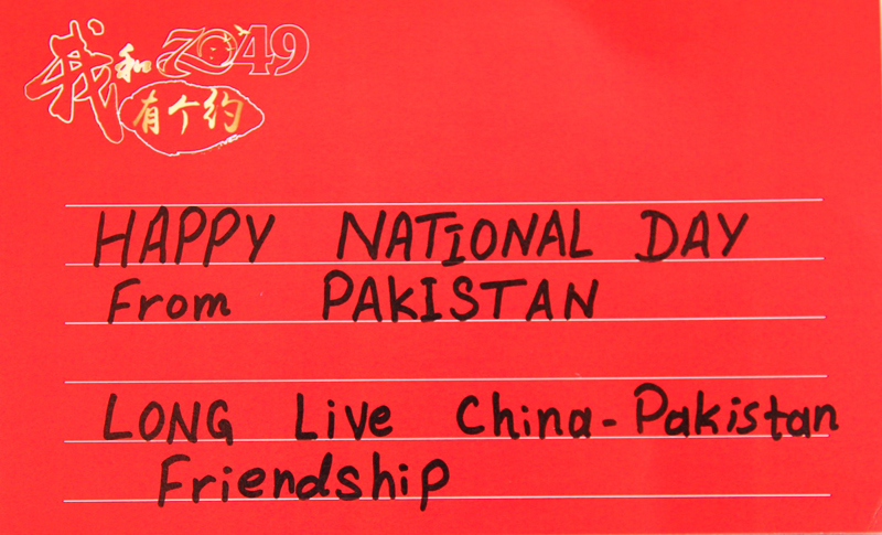 活動還吸引了留學生的積極參與,來自巴基斯坦的學生在明信片上用英文寫道,“國慶節(jié)快樂!祝中巴友誼長存!”