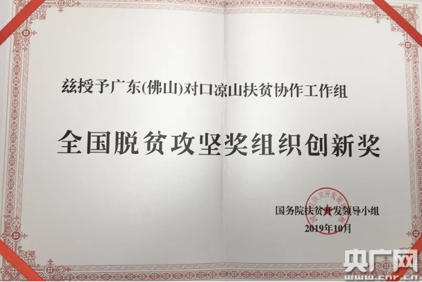 佛山對口涼山扶貧協(xié)作獲全國脫貧攻堅(jiān)獎組織創(chuàng)新獎。(央廣網(wǎng)發(fā) 佛山市委宣傳部供圖)