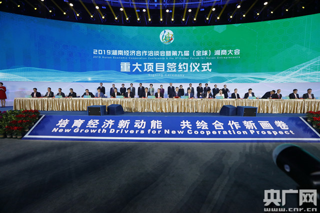 央廣網益陽10月29日消息(記者鄧文輝)今天(29日)上午,2019湖南經濟合作洽談會暨第九屆(全球)湘商大會在湖南益陽開幕。包括35家世界500強、中國500強、中國民營500強在內的共計1000余家知名企業,255家全球湖南商會,銀行、證券、保險等金融機構,高校、科研機構,湖南省內民營企業家代表以及兄弟省區市代表團匯聚一堂,同敘鄉情、共享機遇,共簽署各類投資合同、協議項目237個,項目總投資為1660.72億元,引進資金1633.18億元。