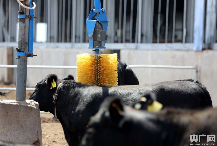 牛舍里大大小小的智能化設備都或多或少地顯示了這是一家現代科技含量十足的養殖基地,與傳統的養殖場有很大的不同。臉上曬得黑里透紅的基地負責人楊劍在現代化的牛圈里,干脆拉下了口罩:“看看,我們的牛圈空氣里,沒有濃烈的氣味;牛舍一直保持著干燥整潔,自行研制的牛體刷為牛兒們自動按摩,所有的牛都在攝像頭下活動,嚴禁給它們使用抗生素的藥物。這酷似五星級賓館的牛舍,才能產出高品質的安格斯牛肉!”