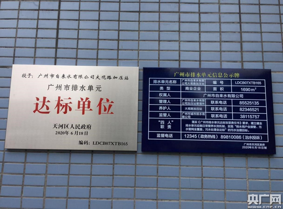 央廣網(wǎng)廣州8月20日消息(記者鄭澍 通訊員趙雪峰 趙中華)近日,記者發(fā)現(xiàn)位于廣州市天河區(qū)新塘街轄內(nèi)的廣州市自來水有限公司大觀路加壓站,大門口墻壁的醒目位置掛著2塊特殊的門牌,上面顯示“廣州市排水單元達(dá)標(biāo)單位”和“廣州市排水單元信息公示牌”,該公示牌上清晰的記錄著排水單元名稱、類型、權(quán)屬人、管理人、養(yǎng)護(hù)人、監(jiān)管人、“四人”職責(zé)、監(jiān)督電話等關(guān)鍵信息。記者現(xiàn)場走訪發(fā)現(xiàn),近期在天河區(qū)的一些樓宇門口陸陸續(xù)續(xù)都掛上了這樣統(tǒng)一標(biāo)準(zhǔn)、統(tǒng)一制作的2塊牌子,掛了牌的排水單元類型包括醫(yī)院學(xué)校、機(jī)關(guān)企事業(yè)單位、商業(yè)企業(yè)等。