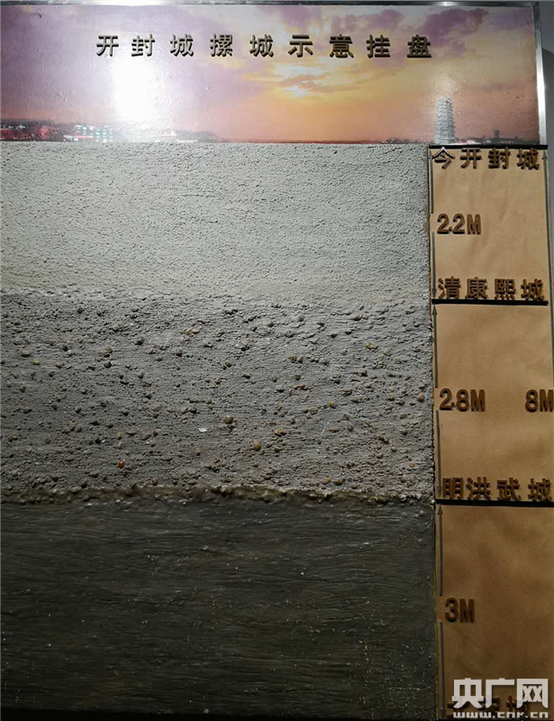 《開封城摞城示意掛盤》,我們可以清楚地看到古城開封城下的三座城池,3米以下的北宋城,2.8米以下的明洪武城,2.2米以下的清康熙城(今開封城)。(總臺央廣記者 任磊萍 攝)