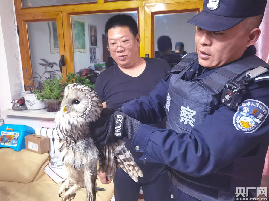 當晚22時許,伊爾施邊境派出所接到轄區(qū)居民報警,稱其在家里闖進一只疑似貓頭鷹。民警立即趕赴現(xiàn)場,檢查發(fā)現(xiàn),該動物身體長約40厘米,翅展80cm,有橫斑,爪子比較鋒利,雖然身上并無明顯外傷,但其身子虛弱。民警遂將其帶回派出所找來食物和水對其進行喂養(yǎng),幫助恢復體力。經(jīng)專家人士辨認,此動物為國家二級保護動物貓頭鷹。目前,該貓頭鷹已移交當?shù)厣植块T送往有救治條件的場所進一步治療,待傷勢痊愈后放歸大自然。
