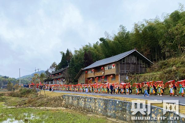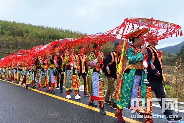 湖南隆回虎形山瑤族鄉崇木凼村,婚禮隊伍浩浩蕩蕩(央廣網記者 堯遙 攝)