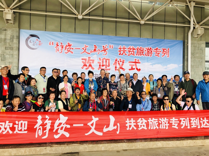 2020年跨省游政策放開后全國首趟鐵路扶貧旅游專列“靜安-文山號”成功開行(央廣網(wǎng)發(fā) 靜安新聞辦供圖)