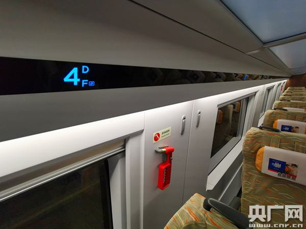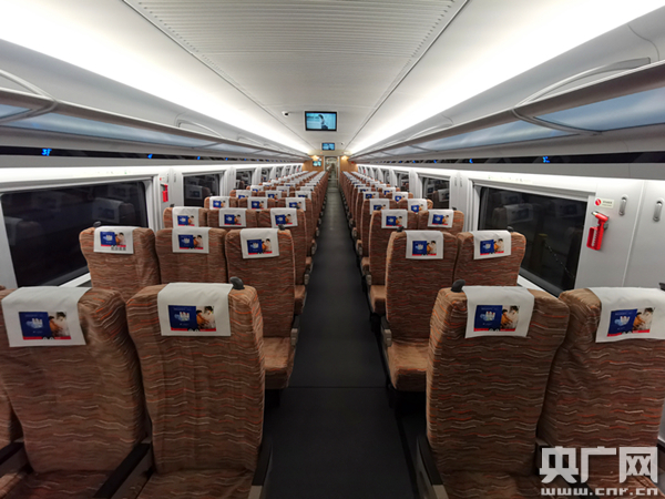 CR300BF型“復興號”動車組全列采用8輛編組,總定員613人,其中一等座48個席位,二等座565個席位。每節車廂內設置了4個溫度傳感器,對車內溫度的感應更敏感,智能空調系統讓車內溫度更適宜。行李架過道邊緣增加250個座位顯示器,方便旅客查找核對本人座席。每節車廂內設置半球攝像機、通道區域設置全景攝像機,可對車廂內區域進行實時監控。電茶爐采用先進的電磁式加熱方式,實現加熱元件和水分離,并具備安全童鎖功能,防止兒童燙傷。車內增加車載無線系統,每節車廂兩端增加2個WIFI天線,為旅客上網、刷劇提供便利條件。