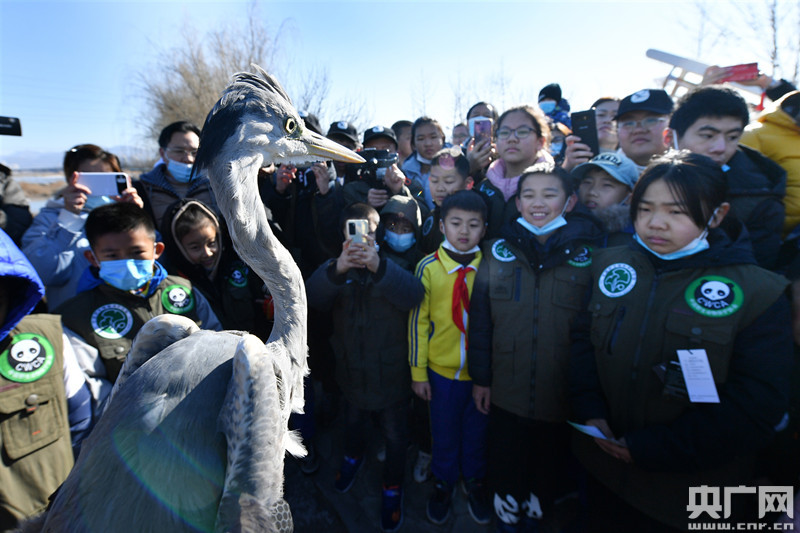 志愿者在科普并放飛當地自然資源局救護的國家三有保護鳥類蒼鷺(央廣網發 王海濱 攝)