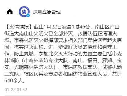 1月22日凌晨1時46分,現場明火全部撲滅,無人員傷亡情況。救援人員正有序清理火場,3支隊伍及救援車輛看守火場,防止復燃。此次山火主要燃燒物為灌木、桉樹和雜草。相關部門正在調查起火原因、核實過火面積。本次增援共投入市、區森林消防隊伍(市大隊,南山、福田、羅湖、寶安、光明)110人,市消防救援支隊134人,武警執勤三支隊136人,轄區民兵150人,志愿者和大南山公園工作人員110人,共計約640人!