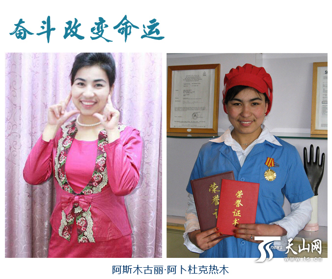 她是疏附縣烏帕爾鄉(xiāng)百西瓦村一個(gè)普通農(nóng)民, 2007年第一次隨鄉(xiāng)里組織前往天津蘭奇手套廠務(wù)工,剛進(jìn)蘭奇公司時(shí),語言不通、技能不熟,困難重重。阿斯木古麗從最基礎(chǔ)的日常用語學(xué)起,日夜苦練。一個(gè)月后,她已經(jīng)能用漢語和班組組長進(jìn)行基礎(chǔ)對話了,。經(jīng)過幾個(gè)月的刻苦努力,她高標(biāo)準(zhǔn)地掌握了公司的脫膜包裝業(yè)務(wù),先后被破格提拔為烘箱員、品質(zhì)檢驗(yàn)員、班組長,她所帶的班組總能超額完成生產(chǎn)任務(wù)。2007年,阿斯木古麗被評為天津市勞動(dòng)模范。2011年,阿斯木古麗走進(jìn)了中國勞動(dòng)學(xué)院深造。