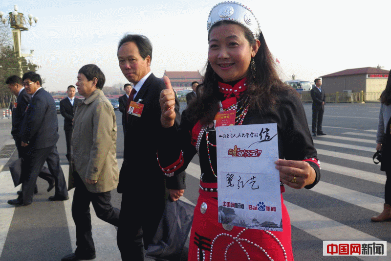 面對實現偉大復興中國夢征途中的一系列問題,習近平總書記總結中國經驗、針對中國難題,提出“四個全面”戰略布局。在2015年全國兩會上,“四個全面”成為主旋律貫穿會場上下、話題內外。在中國網發起的“來自人民大會堂的一封信”活動中,全國人大代表、政協委員紛紛為“四個全面”戰略點贊。中國網將把代表、委員的簽名信從全國兩會現場郵寄給祖國各地的網友,讓廣大網友與人大代表、政協委員共同點贊“四個全面”!圖為全國人大代表、云南省臨滄市滄源佤族自治縣國門小學數學教師鮑紅藝為“四個全面”戰略點贊。動態圖片由中國網記者陳維松、魏婧及宋一安拍攝