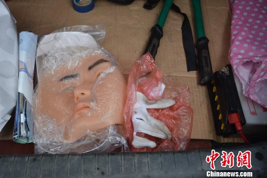 在查獲的作案車輛內,民警現場提取到口罩、假發、硅膠面具、電擊棍、匕首、手套、封口膠、約束帶、彈弓、望遠鏡、假牌照等大量作案工具。