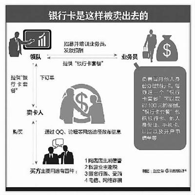發放報酬的人被稱為“領隊”,他們負責招募并培訓“業務員”,收集并囤積“銀行卡套餐”,并在接到來自“賣卡人”的訂單后,將“銀行卡套餐”發放給他們。而“賣卡人”則負責通過QQ、論壇等網絡途徑散布買賣銀行卡的信息,等待買家上門,“銀行卡套餐”價格在600元至1200元之間不等。