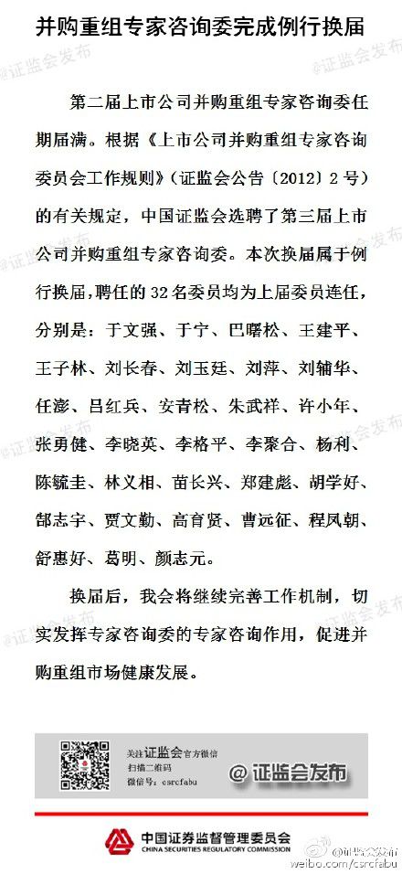 中國經濟網北京9月11日訊(記者向婷)今日證監會召開新聞發布會,新聞發言人鄧舸表示,并購重組專家咨詢委完成換屆,本次換屆屬于例行換屆,32位委員均為上屆委員連任,包括巴曙松、許小年、曹遠征等。