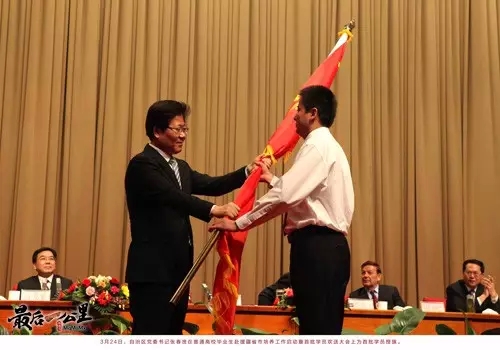 2011年3月24日,張春賢在普通高校畢業生赴援疆省市培養工作啟動大會上為首屆學員授旗