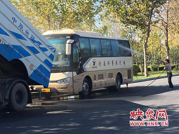 這輛車車牌號為豫AE0073的灑水車,車身上印有“中原環衛”字樣。灑水車的尾部接出一根水管,一名男子拿著水槍向一輛大巴車噴水。旁邊還站著一名男子一邊抽著煙,一邊與洗車男子有說有笑。大巴車的車牌號為豫AP6021,車身上寫著“河南外事旅游”。