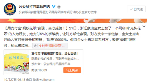 “螞蟻花唄”官方微博早在5月8日就發表聲明稱,將嚴打“套現”,違規商家將被封號或凍結賬戶資金。公安部打四黑除四害官微也在10月27日發布消息提醒網民,當心受騙!