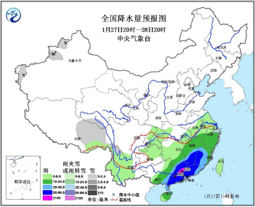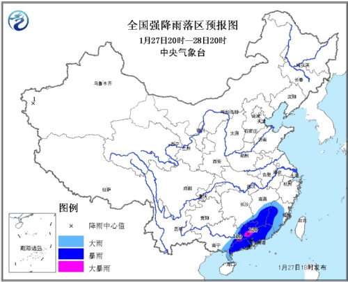 受南支槽和偏南暖濕氣流共同影響,預計27日20時至28日20時,廣西東部、廣東、江西南部以及福建大部等地有大雨或暴雨,其中,廣東中北部的局部地區有大暴雨(100~120毫米);上述地區最大小時雨強可達20~30毫米。為此,中央氣象臺1月27日18時發布暴雨藍色預警。