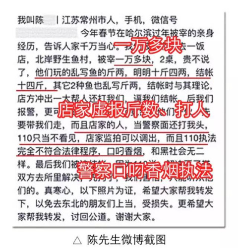 陳先生在微博上發文描述了自己春節在哈爾濱被宰的經歷,“萬元鐵鍋燉”的遭遇讓大多數網友同情,并“一片倒”地譴責北岸野生漁村餐廳“坑人又跌份”。
