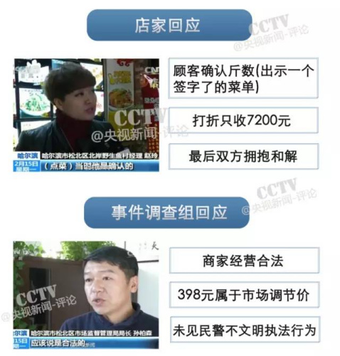 隨即媒體爆出更多細節,諸如“北岸野生漁村飯店”工商登記實為“北岸漁村飯店”,并無標榜的“野生”二字;餐飲服務許可證已于2月4日到期;更多同時同地的宰客事件被爆出;當地導游爆料,帶游客去涉事飯店消費可獲60%提成。