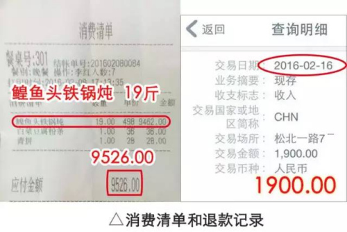 與陳先生有相同遭遇的上海趙先生向媒體反饋,2月8日曾與家人在涉事飯店消費19斤鰉魚頭,花費9526元,向當地12358熱線投訴后,昨日收到涉事飯店1900元賠償款。