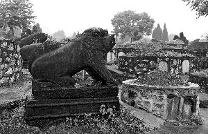 在廣西桂林市靖江王陵內(nèi),一尊神獸雕塑立在一片私墳之中。新華社發(fā)