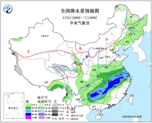 預計,6日08時至7日08時,湖北東部、安徽中南部、江蘇中南部、上海、浙江北部、江西北部、湖南中部和東北部、貴州東南部、廣西北部等地有大雨,其中,安徽南部、湖北東南部、江西北部、湖南中部和東北部、貴州東南部等地的部分地區有暴雨,局地大暴雨(100~120毫米);上述部分地區有短時強降水,最大小時雨強20~40毫米,局地伴有雷暴大風或冰雹。中央氣象臺4月6日06時繼續發布暴雨藍色預警。