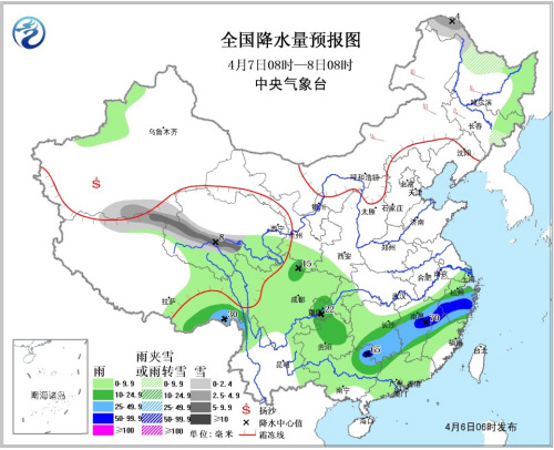 中央氣象臺發布暴雨藍色預警 局地有大暴雨或冰雹,4月4日20時至5日20時,黑龍江東北部、青海南部、西藏東部等地有雨夾雪;伊犁河谷、西北地區東部、西藏東南部、云南西部和南部、西南地區東部、黃淮西部、江淮中西部、江漢、江南西部和南部、華南大部等地有小到中雨,局地有大雨。