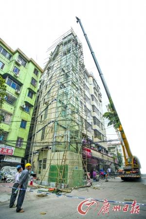昨天下午,違建電梯正在拆除中。該建筑樓高7層,1~6樓已出租,7層是業主自住,一樓鐵門直通電梯門,電梯只停1樓和7樓。 廣州日報記者 蘇俊杰攝