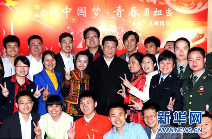 2013年5月4日,中共中央總書記、國家主席、中央軍委主席習近平來到中國航天科技集團公司中國空間技術研究院,同各界優秀青年代表座談并發表重要講話。座談會前,習近平和王靈光(前排左一)以及在展廳參觀的優秀青年代表合影。新華社記者 饒愛民 攝