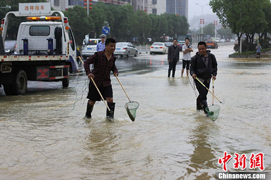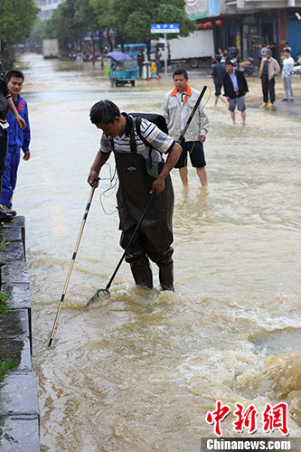 5月8日,湖南省永州市道縣再遭大暴雨襲擊,縣城多處低洼處被水淹,農作物、水產養殖損失嚴重,不少民眾拿起漁具到被淹沒的馬路上捕魚。目前,道縣搶險、核災和災后自救工作已全面有序展開。