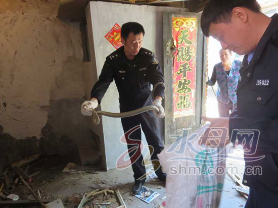 大蛇“蝸居”民宅嚇壞老太 長約2米蛇頭高聳吐蛇信(圖)