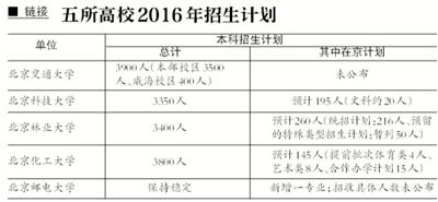 目前,除上述5所高校公布2016年招生計劃外,在京部屬高校中,已有10余所高校“透露”了今年的招生計劃。新京報記者發(fā)現(xiàn),絕大多數(shù)在京招生計劃與去年持平。