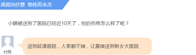 從村民的話中,不難聽出小鵬傷勢的嚴重性。在新鄉市第二人民醫院,小鵬已經在重癥監護室里躺了9天了。小鵬的爸爸蘇永杰說:光手術就花了5萬(含:傷情,醫療費)蘇永杰告訴記者,前段時間家里蓋房子借親戚朋友的錢還沒有還完,現在小鵬的醫療費又花了10多萬,已經把他壓的喘不過氣來。