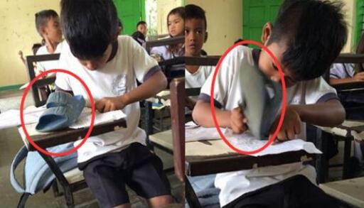 橡膠鞋子當橡皮擦,菲律賓貧童感動人。(圖片來源網絡)